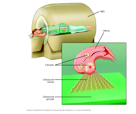 HIFU (High-Intensity Focused Ultrasound): técnica que utiliza ultrassom para aquecer o tecido-alvo até cerca de 65°C, causando a ablação e destruição do mioma. O procedimento é guiado por ressonância magnética para melhor localização dos miomas, sendo conhecido como MRgFUS (Magnetic Resonance guided Focused UltraSound), atualmente aprovada nos EUA, Reino Unido, Alemanha, Japão, entre outros países. Existem estudos que avaliaram a eficácia do HIFU para pacientes com desejo reprodutivo e os resultados parecem ser bons.